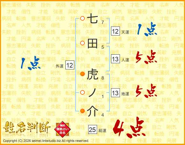 七田虎ノ介さんの総運は25画の4点!