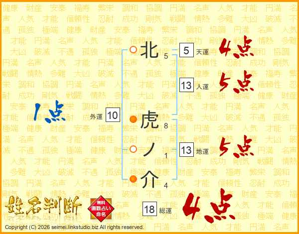 北(5画) 虎(8画)ノ(1画)介(4画)