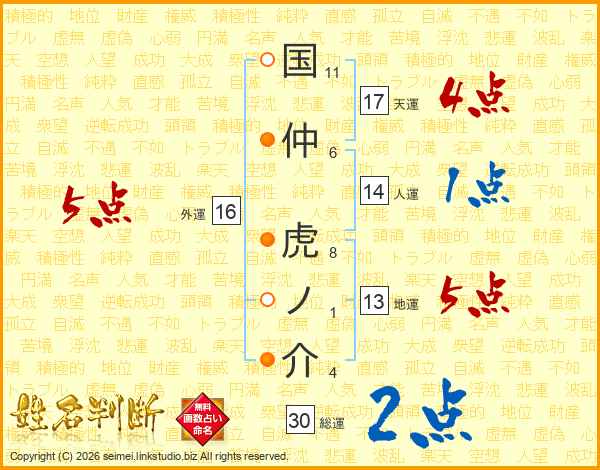 国(11画)仲(6画) 虎(8画)ノ(1画)介(4画)