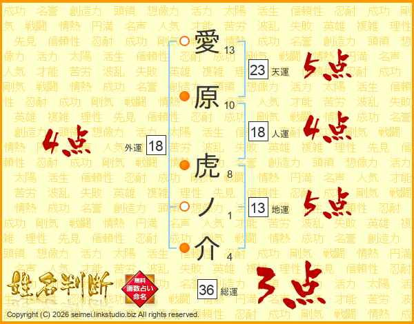 愛(13画)原(10画) 虎(8画)ノ(1画)介(4画)