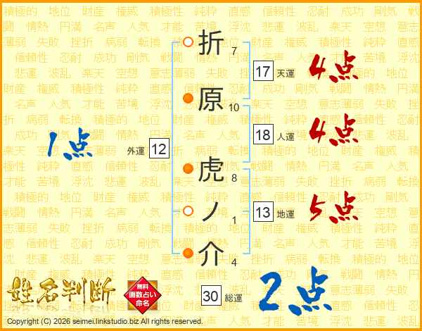 折(7画)原(10画) 虎(8画)ノ(1画)介(4画)