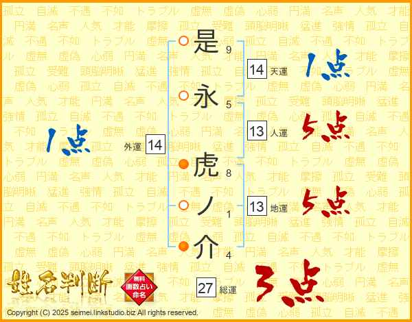 是(9画)永(5画) 虎(8画)ノ(1画)介(4画)