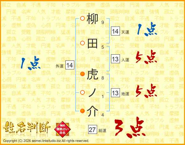 柳(9画)田(5画) 虎(8画)ノ(1画)介(4画)