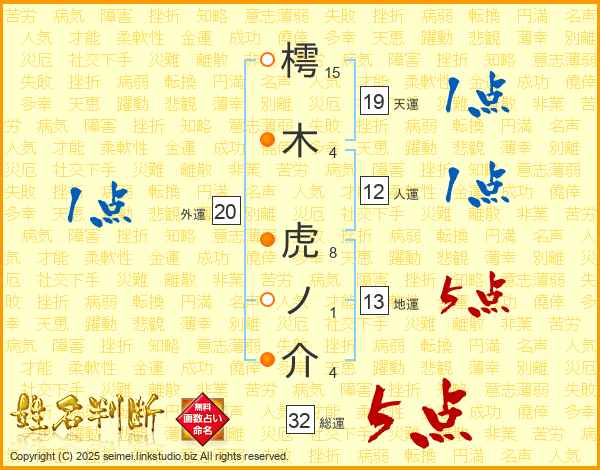 樗木虎ノ介さんの総運は32画の5点!