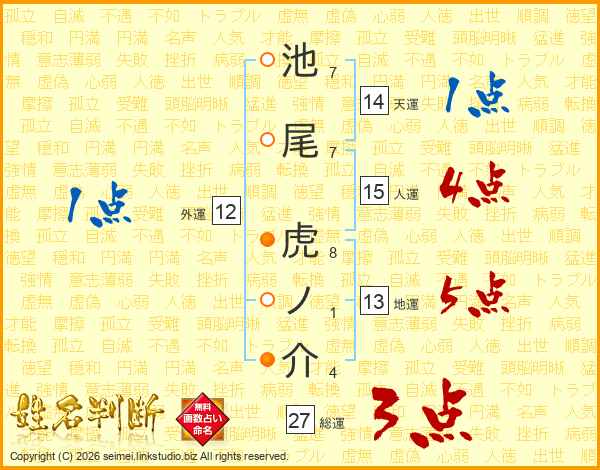池(7画)尾(7画) 虎(8画)ノ(1画)介(4画)