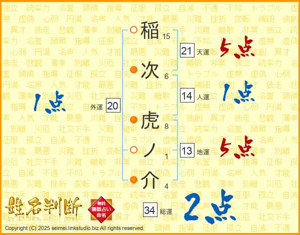 稲(15画)次(6画) 虎(8画)ノ(1画)介(4画)