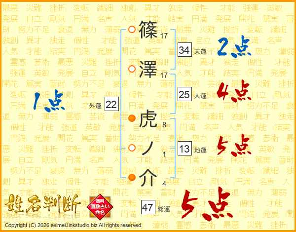 篠(17画)澤(17画) 虎(8画)ノ(1画)介(4画)