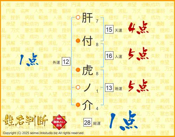 肝(7画)付(8画) 虎(8画)ノ(1画)介(4画)