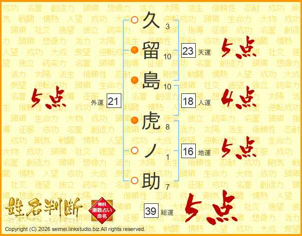 久(3画)留(10画)島(10画) 虎(8画)ノ(1画)助(7画)