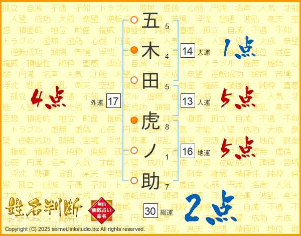 五(5画)木(4画)田(5画) 虎(8画)ノ(1画)助(7画)