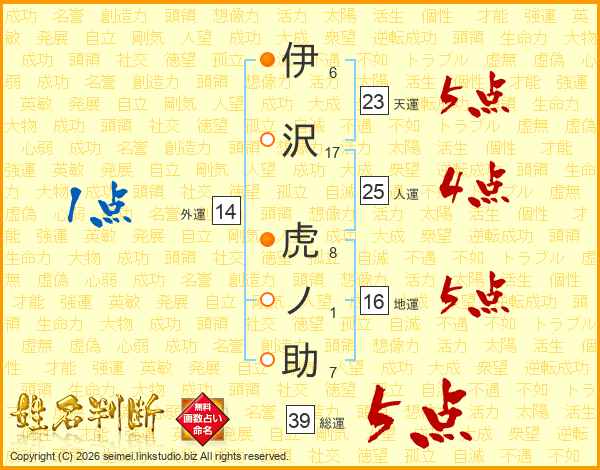伊(6画)沢(17画) 虎(8画)ノ(1画)助(7画)