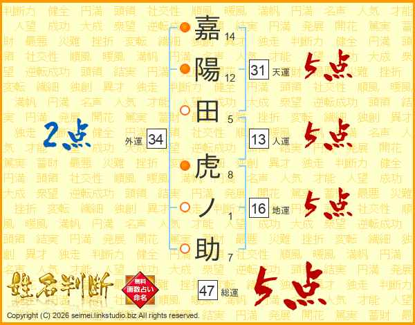 嘉陽田虎ノ助さんの総運は47画の5点!