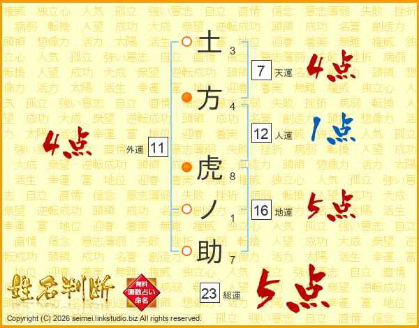土(3画)方(4画) 虎(8画)ノ(1画)助(7画)