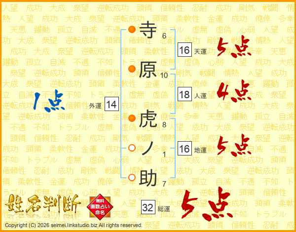 寺原虎ノ助さんの総運は32画の5点!