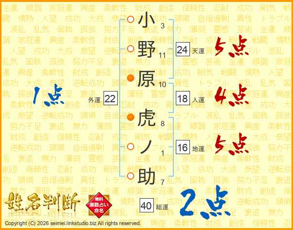 小(3画)野(11画)原(10画) 虎(8画)ノ(1画)助(7画)