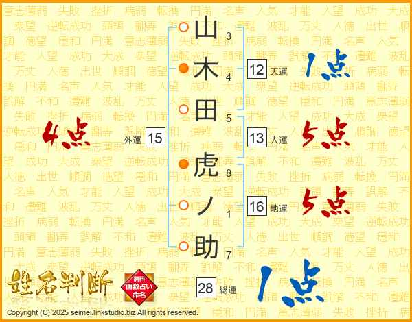 山(3画)木(4画)田(5画) 虎(8画)ノ(1画)助(7画)