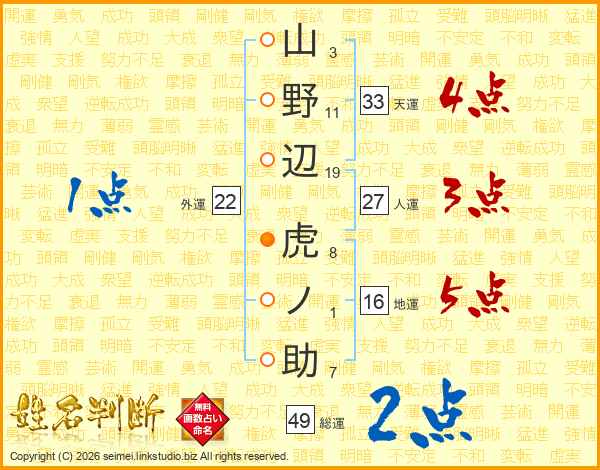 山野辺虎ノ助さんの総運は49画の2点!