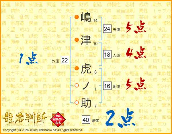 嶋(14画)津(10画) 虎(8画)ノ(1画)助(7画)