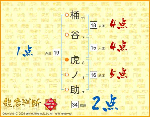 桶(11画)谷(7画) 虎(8画)ノ(1画)助(7画)
