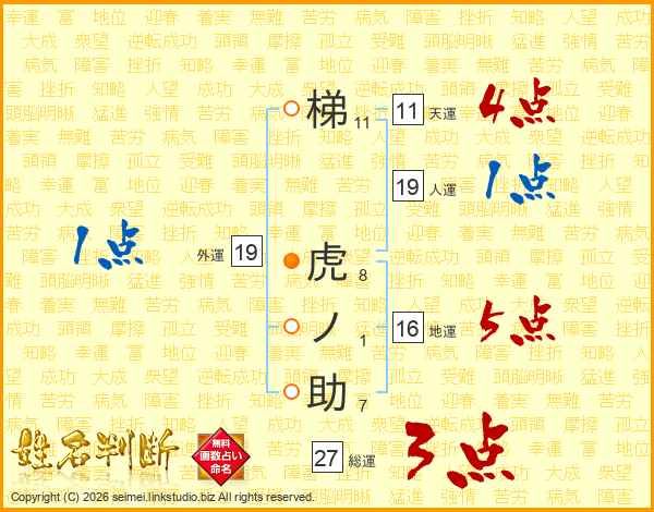 梯(11画) 虎(8画)ノ(1画)助(7画)