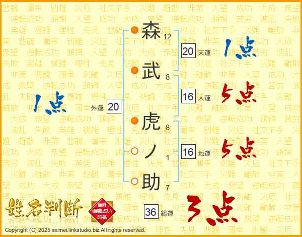 森(12画)武(8画) 虎(8画)ノ(1画)助(7画)