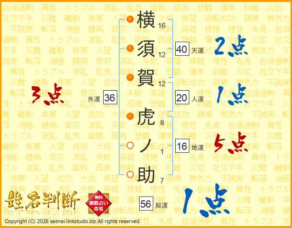 横(16画)須(12画)賀(12画) 虎(8画)ノ(1画)助(7画)