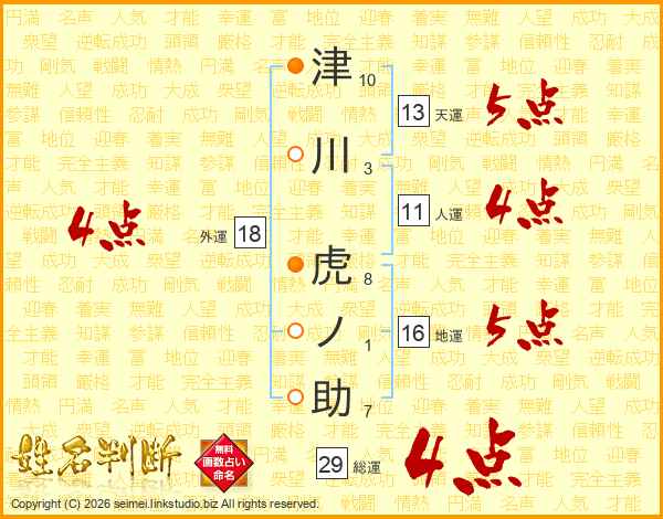 津(10画)川(3画) 虎(8画)ノ(1画)助(7画)