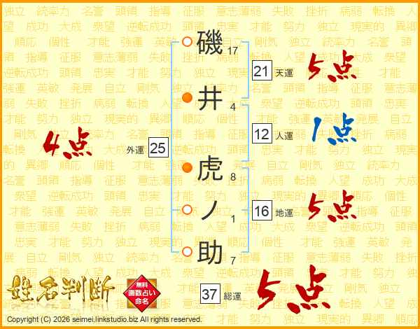 磯井虎ノ助さんの総運は37画の5点!