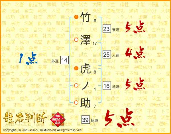 竹澤虎ノ助さんの総運は39画の5点!