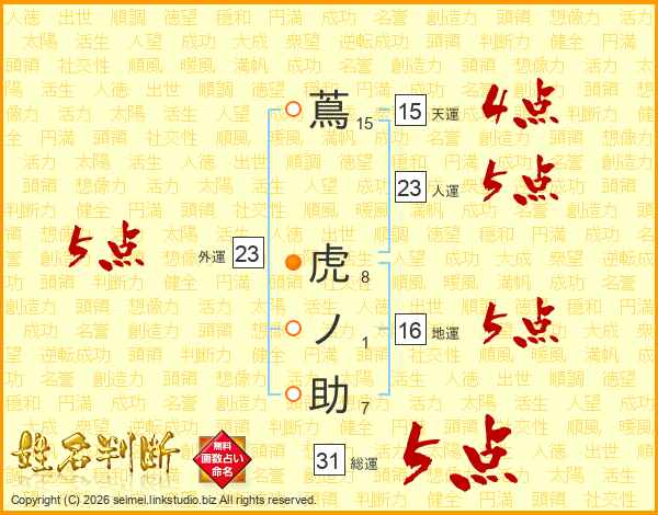 蔦(15画) 虎(8画)ノ(1画)助(7画)