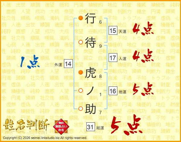 行(6画)待(9画) 虎(8画)ノ(1画)助(7画)