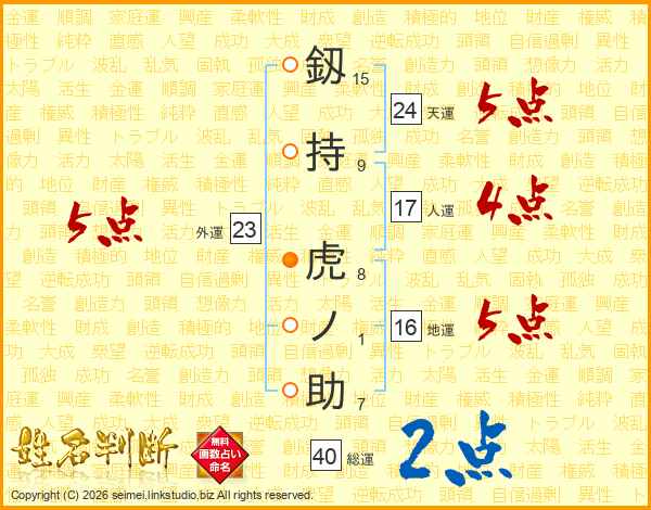 釼(15画)持(9画) 虎(8画)ノ(1画)助(7画)