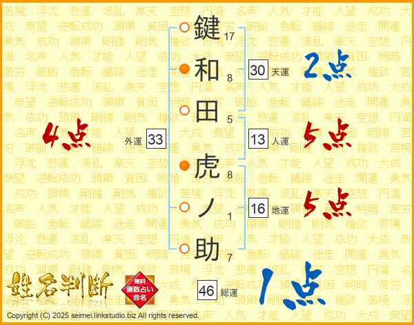 鍵(17画)和(8画)田(5画) 虎(8画)ノ(1画)助(7画)