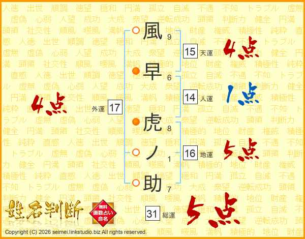 風早虎ノ助さんの総運は31画の5点!