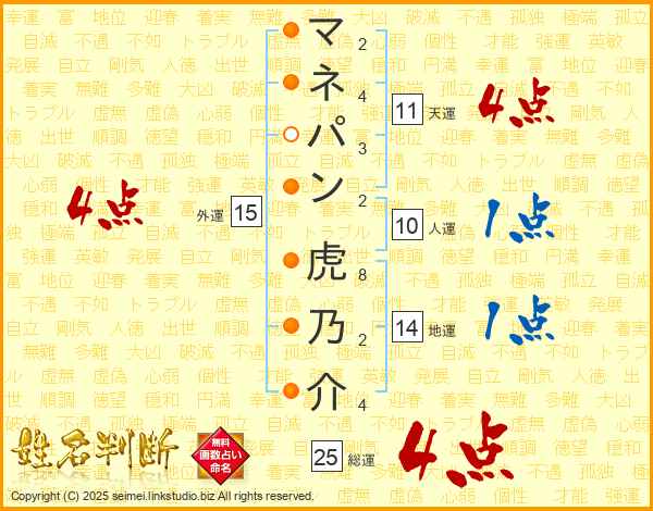 マ(2画)ネ(4画)パ(3画)ン(2画) 虎(8画)乃(2画)介(4画)