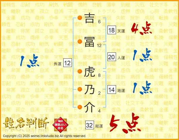 吉(6画)冨(12画) 虎(8画)乃(2画)介(4画)