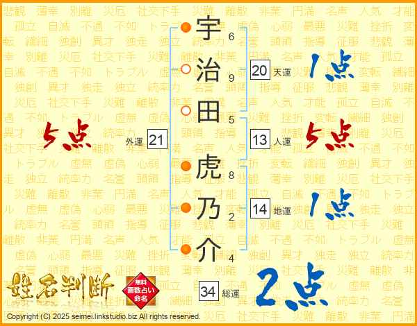 宇(6画)治(9画)田(5画) 虎(8画)乃(2画)介(4画)