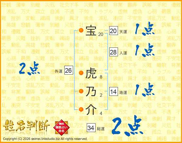 宝(20画) 虎(8画)乃(2画)介(4画)