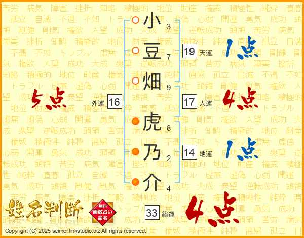 小豆畑虎乃介さんの総運は33画の4点!