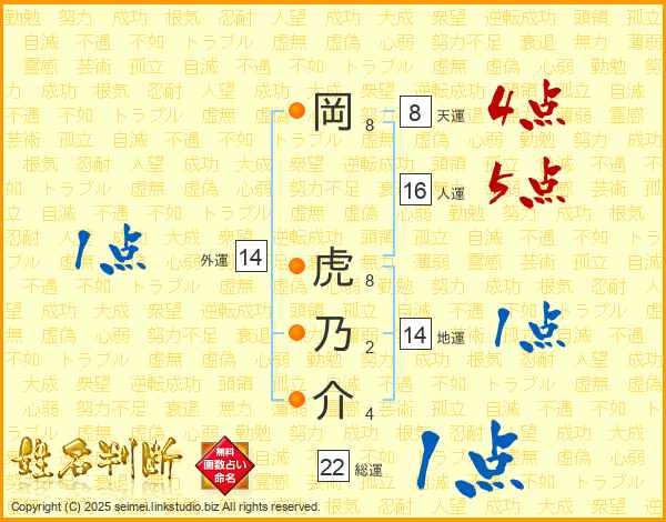岡(8画) 虎(8画)乃(2画)介(4画)