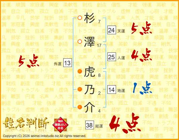 杉(7画)澤(17画) 虎(8画)乃(2画)介(4画)