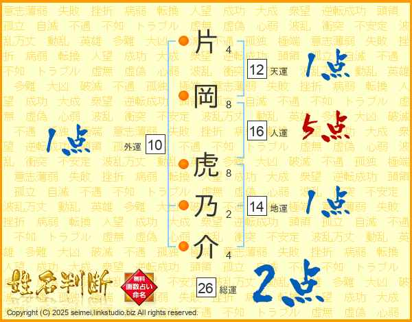 片(4画)岡(8画) 虎(8画)乃(2画)介(4画)