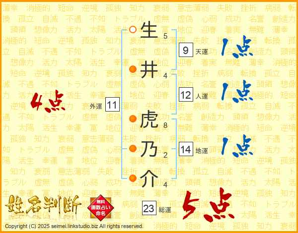 生(5画)井(4画) 虎(8画)乃(2画)介(4画)