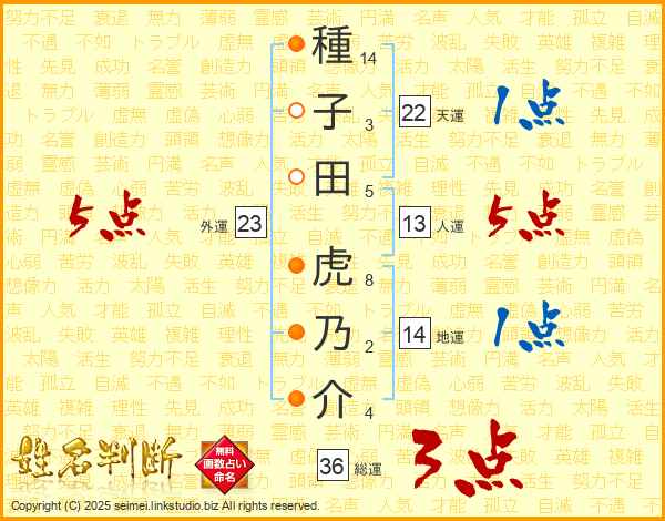 種子田虎乃介さんの総運は36画の3点!