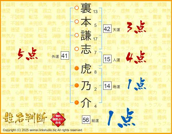 裏本謙志虎乃介さんの総運は56画の1点!