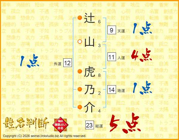 辻(6画)山(3画) 虎(8画)乃(2画)介(4画)
