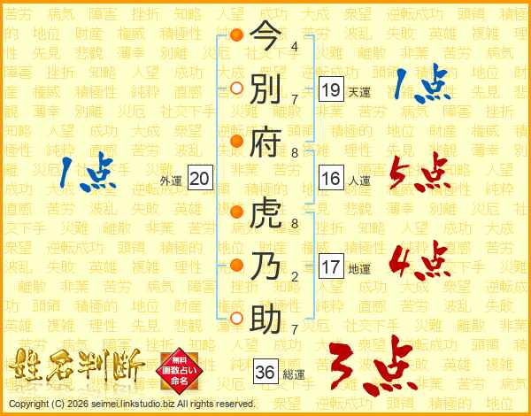 今(4画)別(7画)府(8画) 虎(8画)乃(2画)助(7画)
