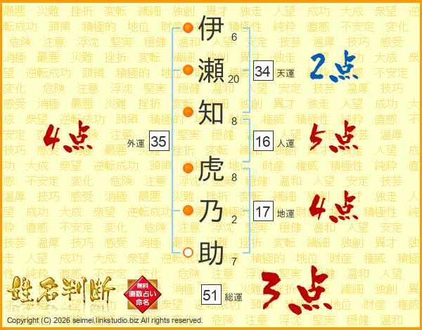 伊瀬知虎乃助さんの総運は51画の3点!