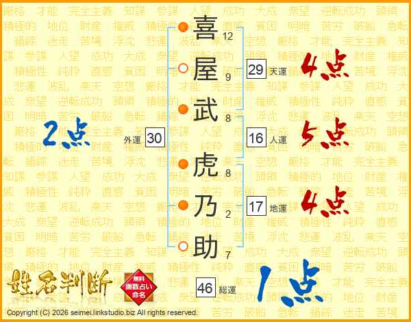 喜(12画)屋(9画)武(8画) 虎(8画)乃(2画)助(7画)