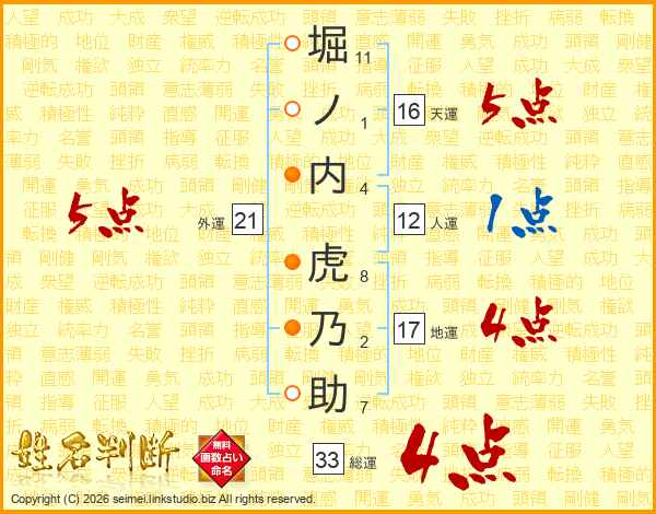堀ノ内虎乃助さんの総運は33画の4点!